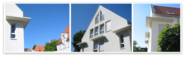 Doppelhaus und Villa in Eibach Doppelhaushälften mit Studioausbau sowie ein frei stehendes Einfamilienhaus mit Zeltdach und klassischer Fassadengestaltung in Nürnberg-Eibach. Fertigstellung 2004.